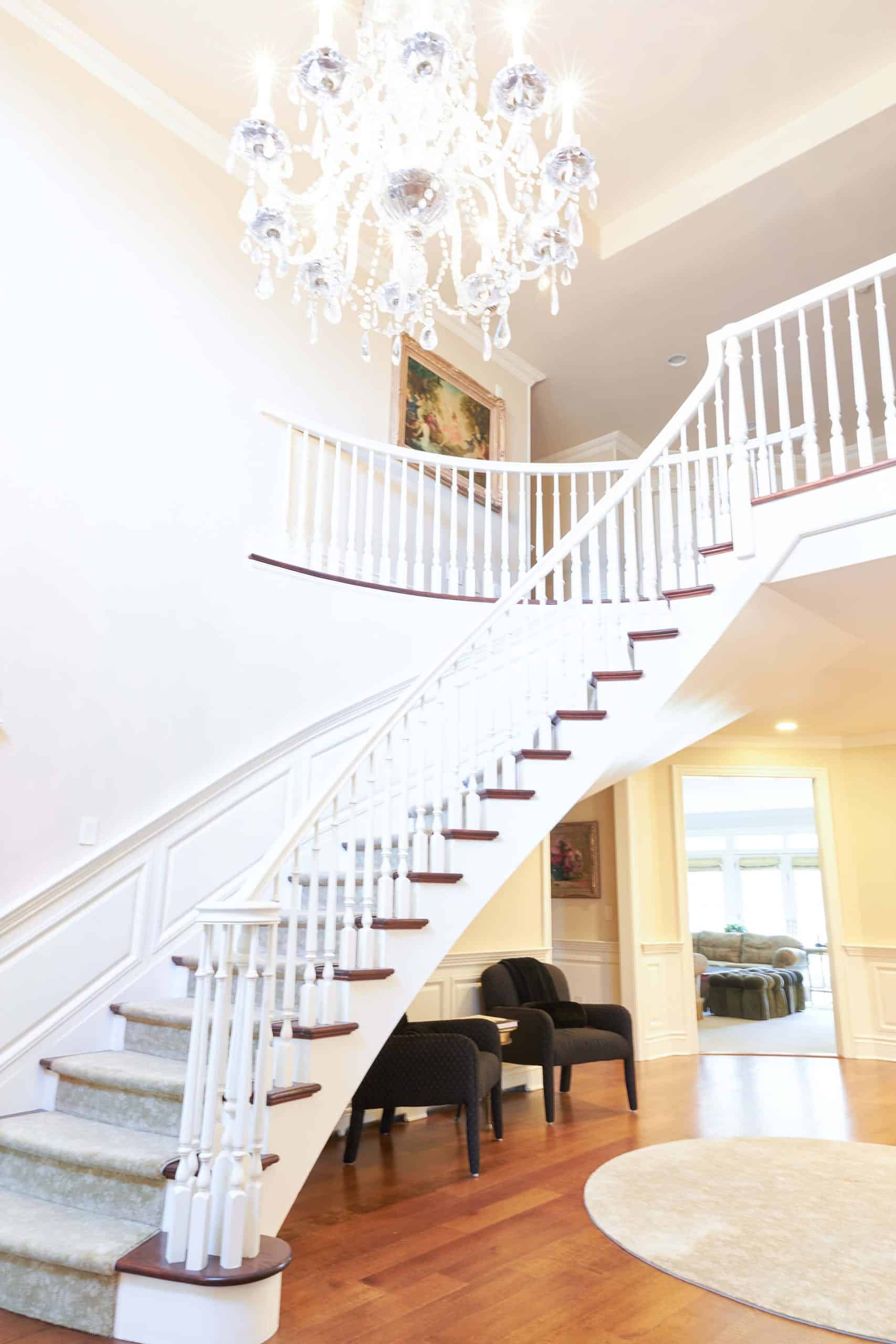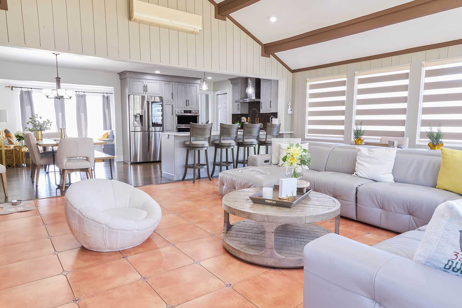 A Kitchen With A Large Island And A Stainless Steel Refrigerator