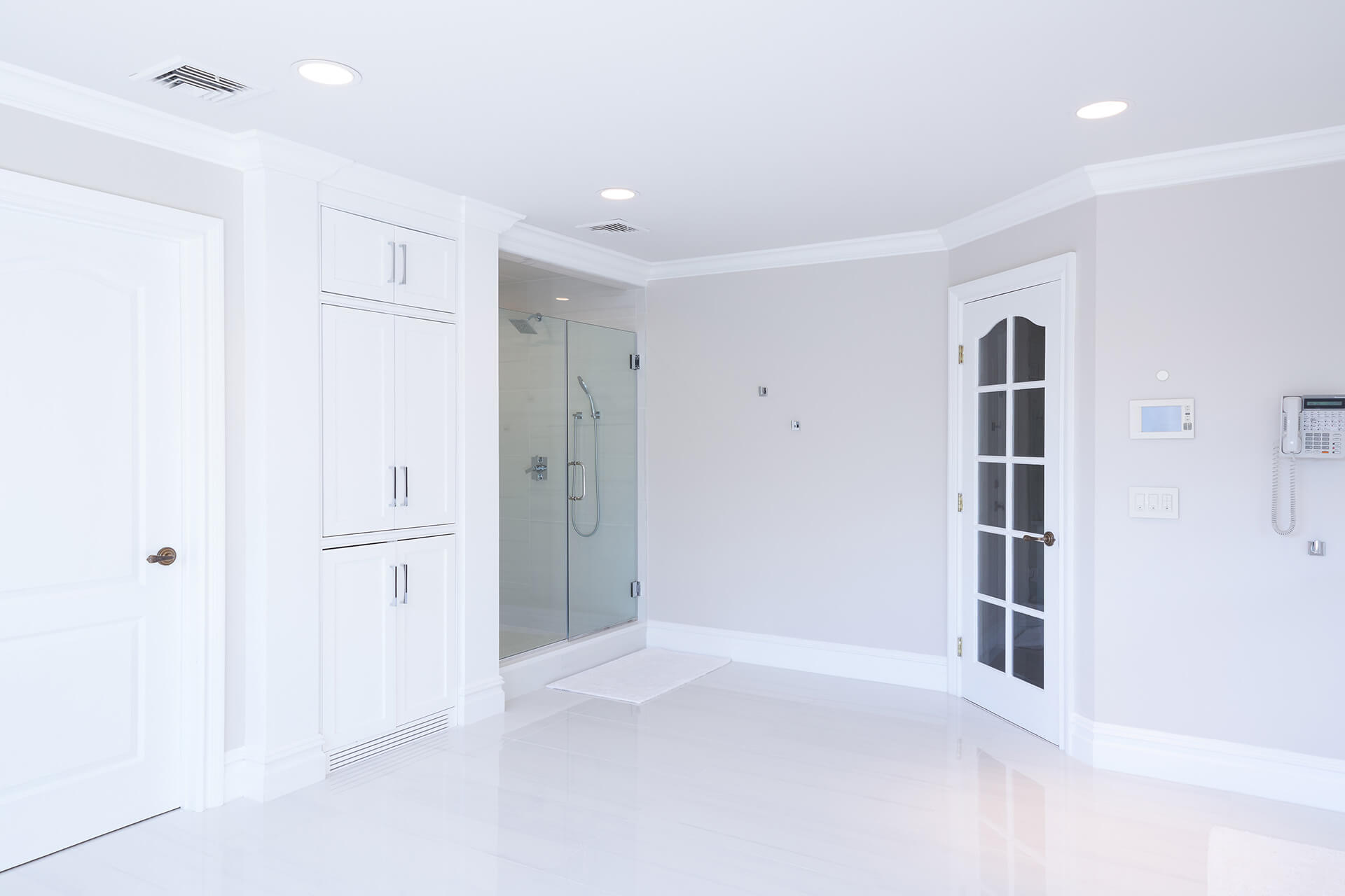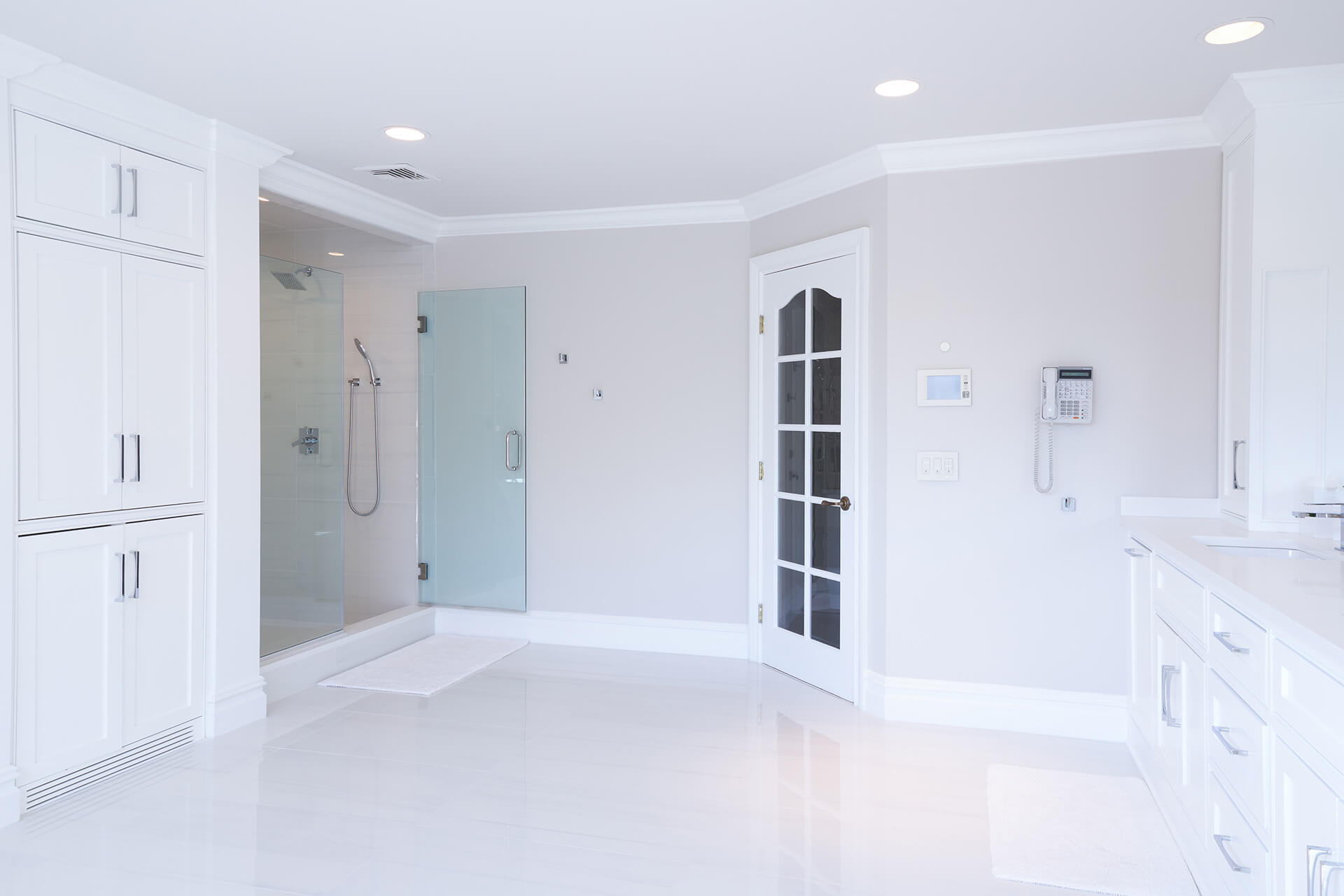 A Kitchen With White Cabinets And A Stainless Steel Dishwasher